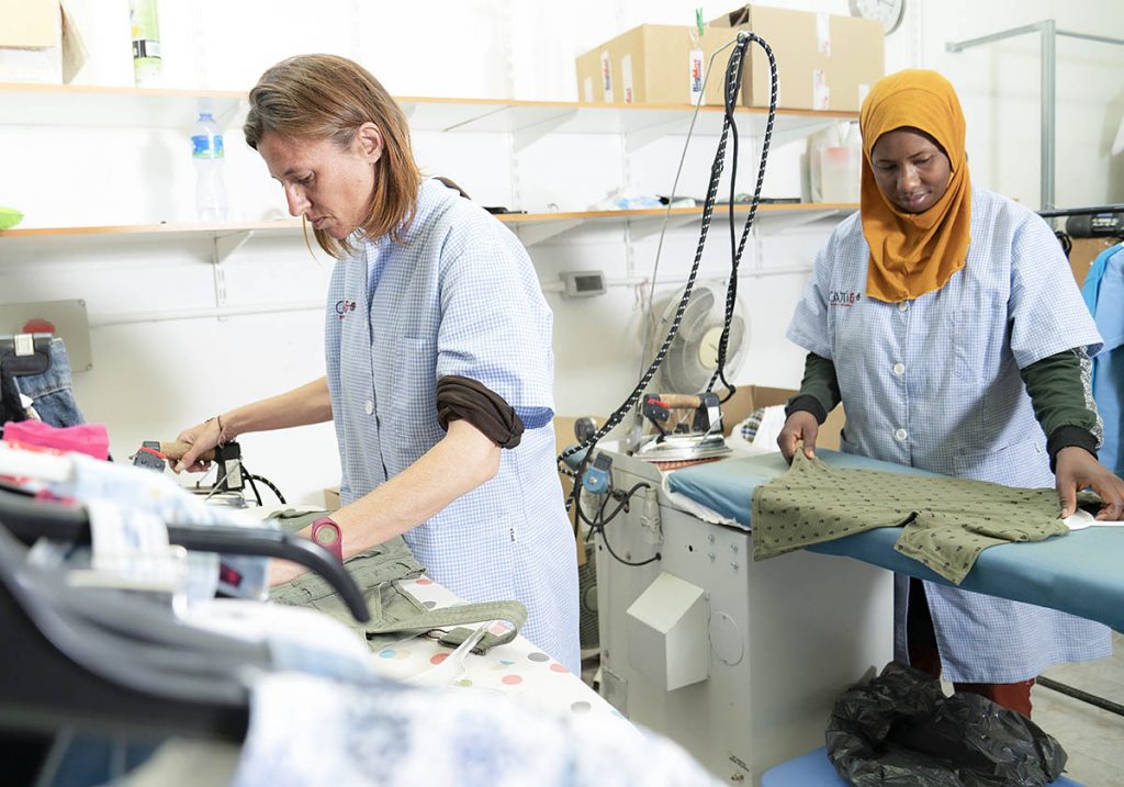 Las prendas recuperadas y en perfectas condiciones ya de nuevo en nuestro centro de trabajo son, planchadas, revisadas, preparadas y etiquetadas para envío a tiendas para puesta a la venta o entregadas de manera digna a familias en situación vulnerable.